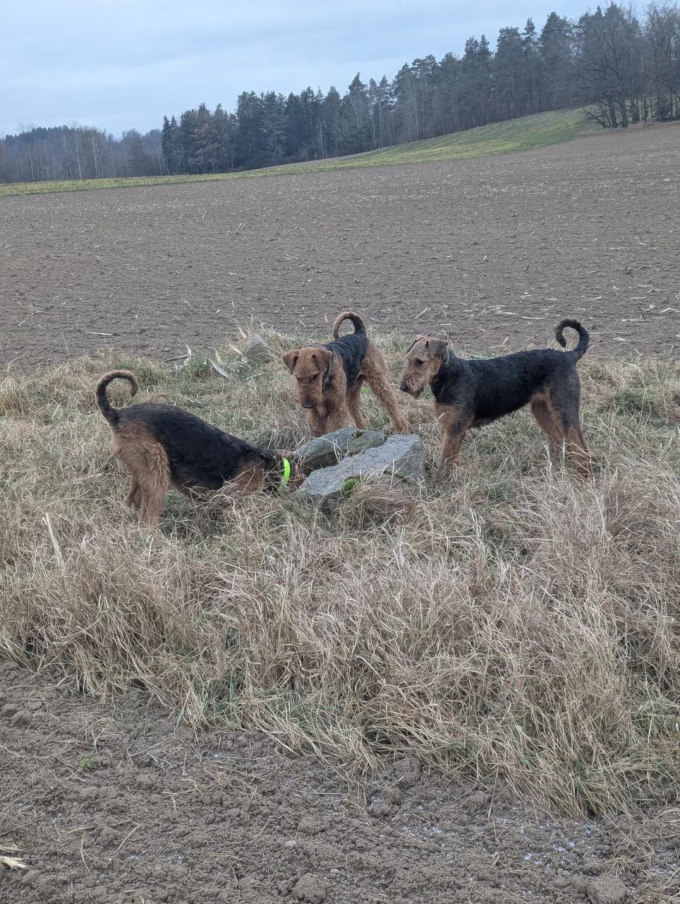 Unsere Airedales beim Mäusesuchen, von rechts nach links unsere Nachzuchthündin aus dem A-Wurf Anna, unser Deckrüde Falco und wie immer mit vollem Einsatz unsere Zuchthündin Enny.